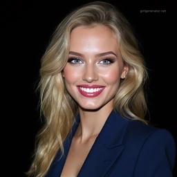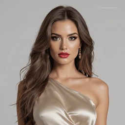 "We return a high-resolution image crafted from your prompt: 20-year-old European woman, luxuriously wavy chest-length hair, full lips, sharp jawline, voluptuous hourglass figure, wearing a one-shoulder champagne-satin midi dress with a thigh-high slit, minimal gold jewelry, flawless studio lighting, Vogue editorial style"